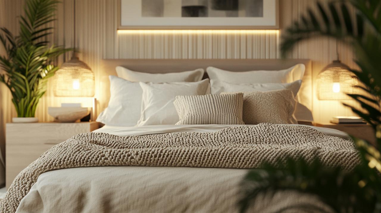 Les coussins jouent un rôle essentiel dans cette accumulation de douceur. Privilégiez des modèles en tricot à grosses mailles, en velours côtelé, en tissu bouclette ou en coton tufté pour créer un effet visuel riche et invitant. La variété des textures stimule agréablement le toucher et renforce la sensation de confort. La tête de lit mérite également une attention particulière. Une version en tissu bouclette, particulièrement tendance actuellement, transforme cet élément fonctionnel en véritable pièce maîtresse décorative.